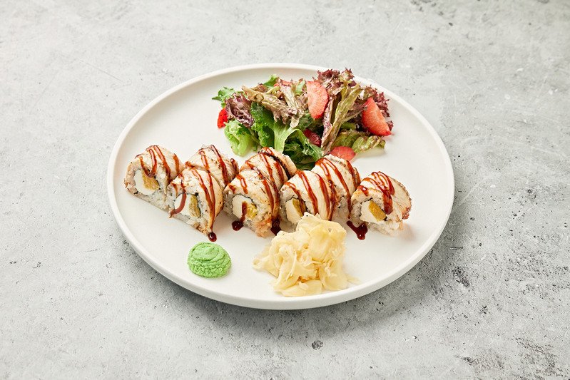 Ролл со сливочным сыром, мандарином, рисом, заправленным соусом сушидзо, угрем, обжаренным в соусе Унаги и миксом салата из листьев фриллиса, лолло россо, чуки и слайсами свежей клубники, заправленный кунжутным соусом. Перед подачей блюдо посыпают дробленным кешью. С роллами подается маринованный имбирь, соевый соус и вассаби
